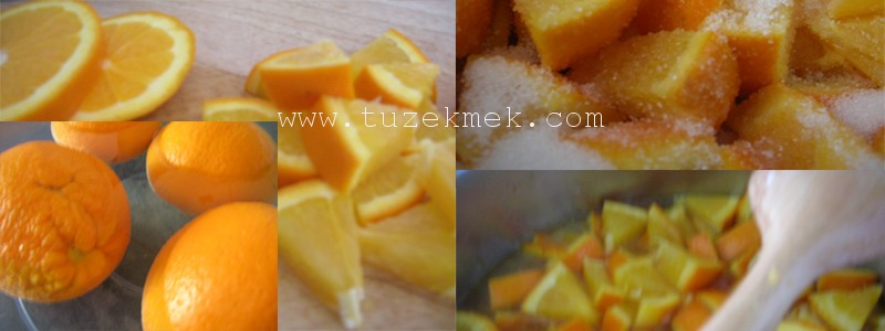 Uygun bir çelik tencerenin dibine bir su bardağı şeker yayılır ve dilimlenen portakallar şeker- portakal dilimleri şeklinde katlandırılır. Üzerinin şekerle kaplı olmasına dikkat edin. Bir gün de şekerle kaynaşması için bekletilir. Beklediğinize değecek:)