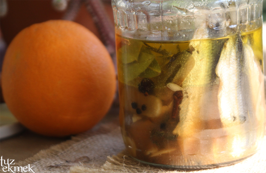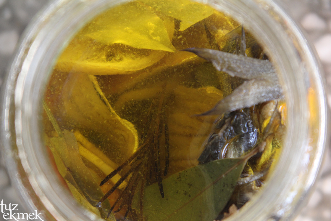 Kurulanmış balıklar kavanoza dizilir üzerine hazırlanan sos dökülür kalan kısım zeytinyağı ile tamamlanır.