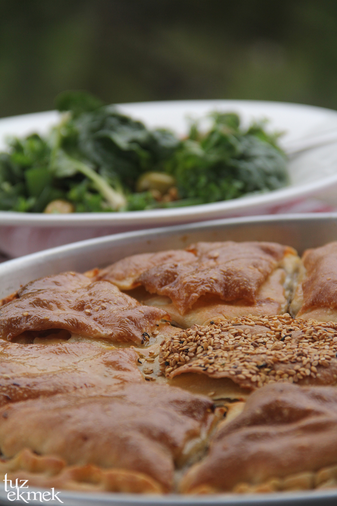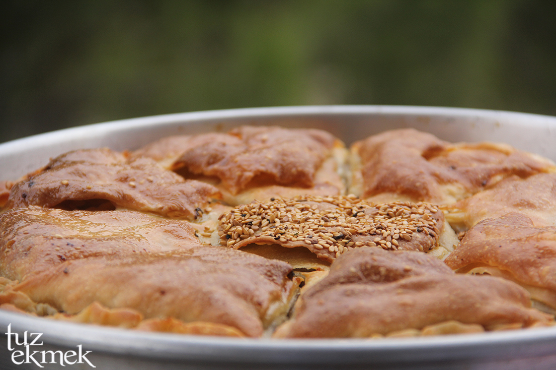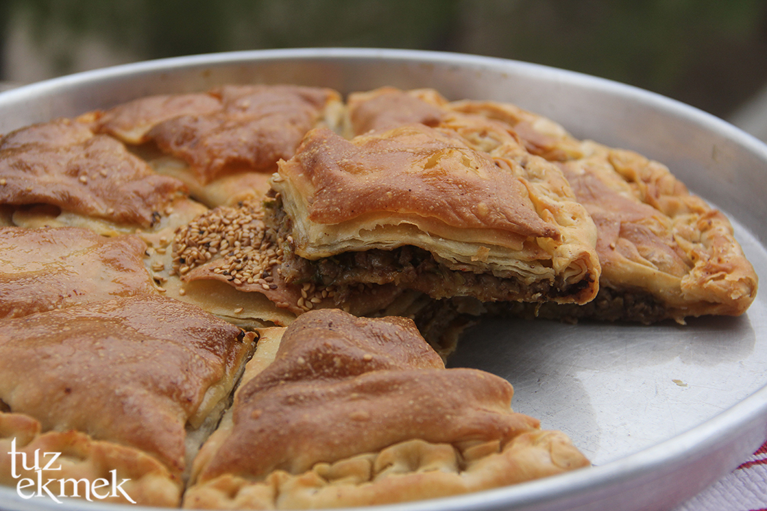 Dinlenen 1. kat hamur fotoğraflarda görülen tepsi çapında açılır. Hamurun kenarlardan biraz taşması gerekir. Hazırlanan iç malzemesi eşit miktarda yayılıp üzerine ikinci kat açılıp yayılır ve kenarı incecik kapatılır.