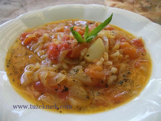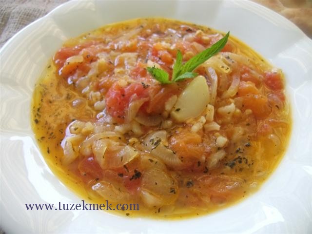 Üzerine yıkanmış pirinç serpilir ve tencerenin kapağı kapatılıp domateslerin sulanmasıyla soğanların ve domateslerin fazla erimeden  belli bir kıvama kadar pişmesi sağlanır. Bu yemeğin püf noktası su ilave etmeden pişirilmesidir. Eğer domatesin suyu yeterli olmadığını hissederseniz azcık sıcak su ilave edebilirsiniz. Çok koyu bir yemek olmayacak, ekmeği batırıp yemek gerekiyor.:))