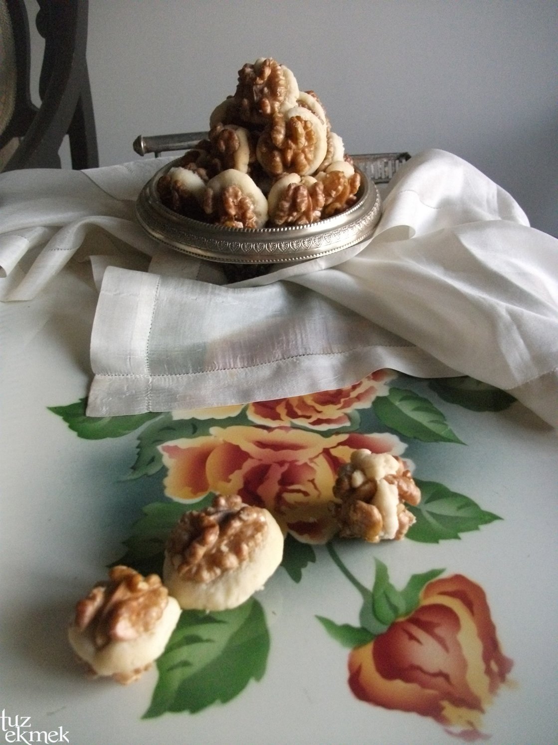 Fındıktan büyükçe alınan hamur yuvarlanıp iki parça cevizin arasına bırakılıp bastırılır kenarlardan bir miktar taşması sağlanır.