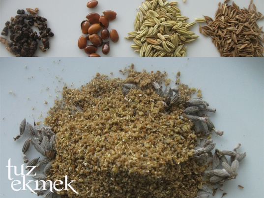 Isıtılmış tohumlar,  lavantayla beraber öğütücüde inceltilir. Tohumlar üst- soldan sağa kakule tohumu, yıldız anason tohumu, rezene tohumu, kimyon tohumu.