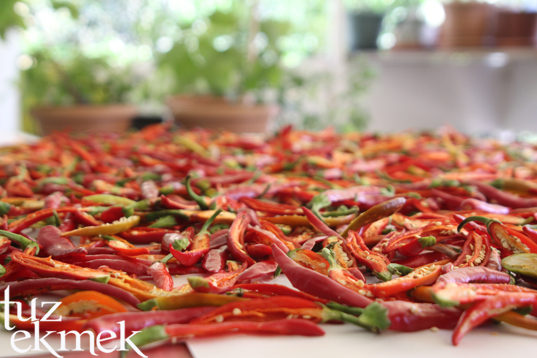 Adana’da benim de kurutmam zordu ama birkaç gündür biberlerim için poyraz vardı ve bu güzelim acıyı yapabildim.