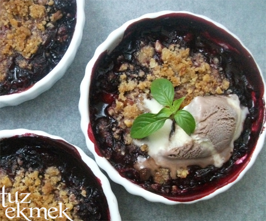 Hafif pişen böğürtlenlerin üzerine hazırlanan pütürlü hamur dağıtılır ve kahverengi olasıya güzelce kızartılır.
