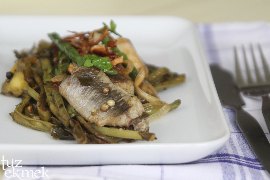 Balıklar bir tabağa alınıp yağın kalanı ilave edilip soğanlar şeffaflaşana kadar kavrulur bir yemek kaşığı kadarı tavada bırakılıp diğerleri alınır.