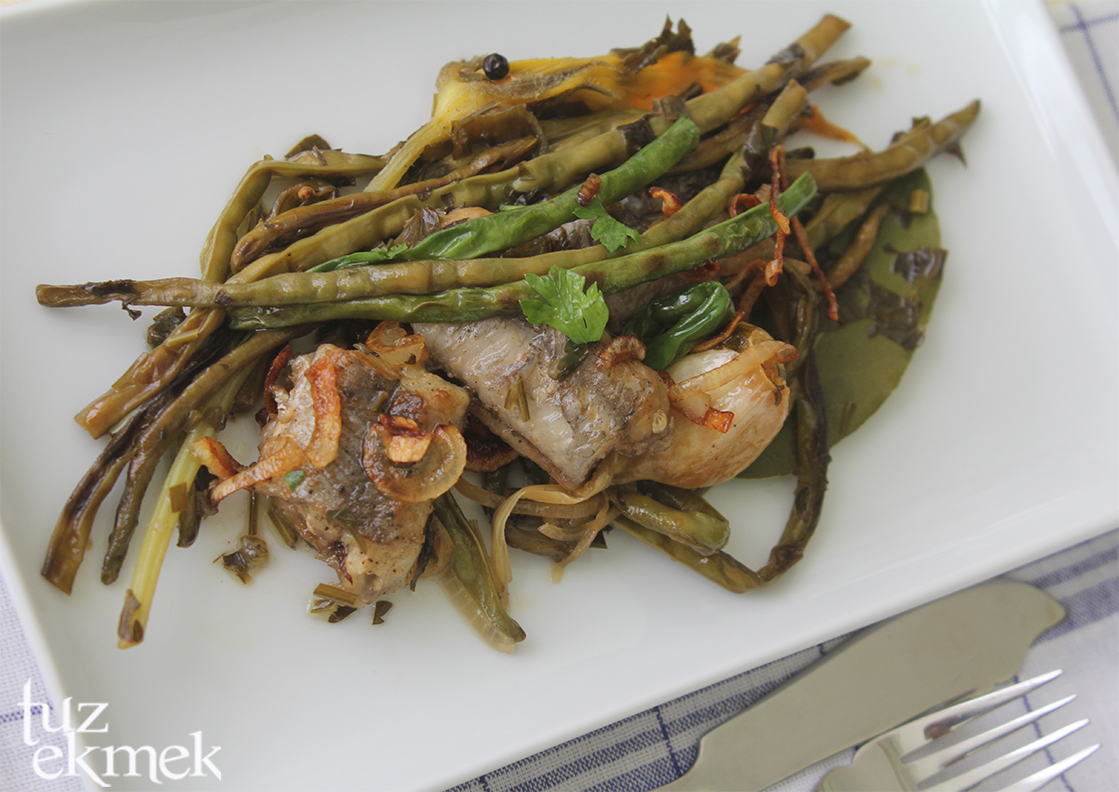 Börülceye yeşilikler ilave edilip karıştılır üzerine kabak çiçekleri, şeffaf soğanlar, balık parçaları ve baharatlarla defne yaprağı da alınıp karıştılır.