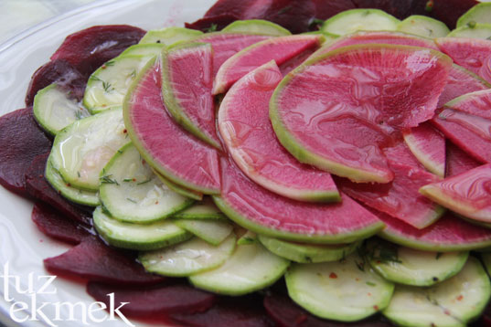 Ben sadece kabak ve pancar carpaccio yapıyordum,karıştırmak çok hoş bir görüntü vermiş,elinize sağlık Sare’cim.