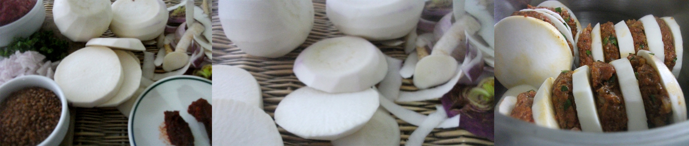 Yoğrulan etten orta büyüklükte köfteler hazırlanır ve bir köfte bir şalgam dilimi şeklinde tencereye dizilir.