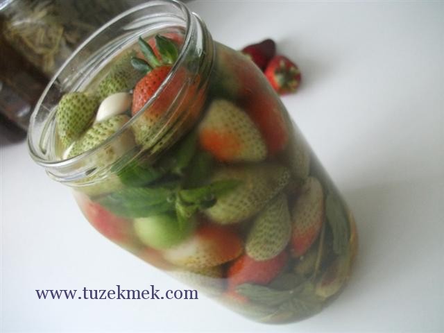 Yıkanmış ve temizlenmış çilekler kavanoza doldurulur. Üzerine iki diş sarımsak ve nane dalını da koyup üzeri sirkeli su ile doldurulur.