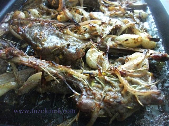 Pişirilecek fırın kabına almadan üzerine biraz deniz tuzu öğütülür ve karıştırılır. Fırın kabına dizilir ve üzerine kalan sos gezdirilir.