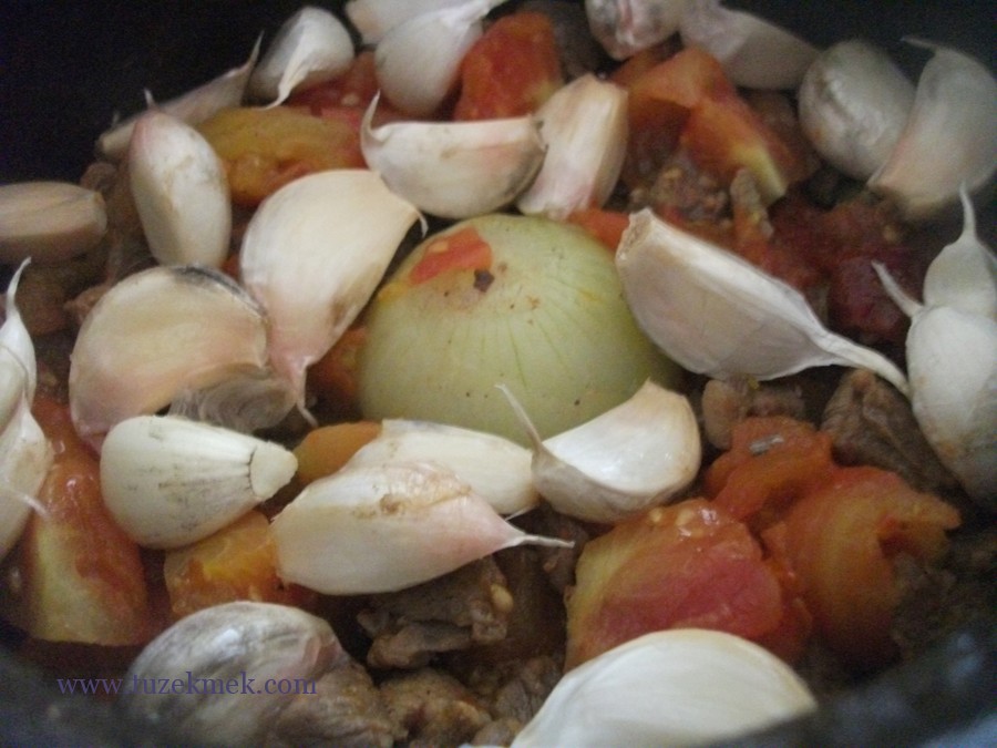 Eğer fırına gönderecekseniz güveç hazırlanır. Sotelenen etler ve domatesin bir kısmı güvecin dibine alınır üzerine sarımsak dişleri dizilir kalan domatesler yayılır, baharatlar ve tuz serpilir ve üzerine biberler zevkinize göre kesilip dizilir. Kalan zeytinyağı gezdirilir. Üzerine 2- 3 tane acı biberleri bütün olarak dizip doğru fırına gönderilir