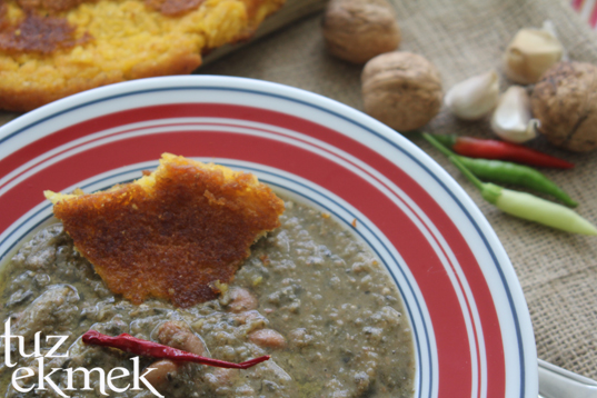 Bu, koyu çorbamsı karışıma incecik kıyılmış sarımsaklar ve rondoda çekilmiş ceviz ilave edilip bir iki taşım kaynatılır. Koyu ise ayırdığımız sudan ilave edilebilir