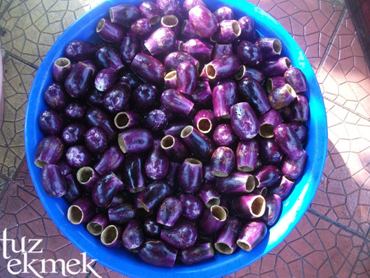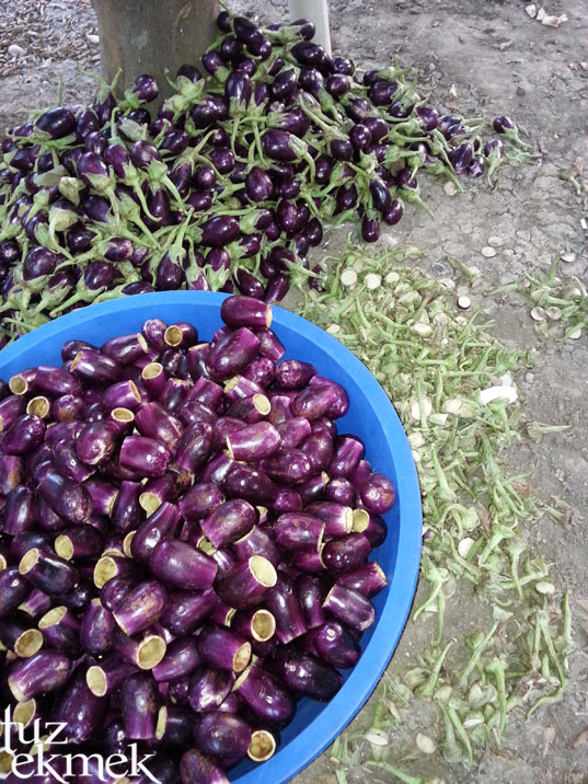 Öyle böyle değil bu iş, birkaç kilo ile halledilmiyor 100 kilolardan bahsediyorum. 1 kiloya 10 adet patlıcan giriyor, gerisi size kalmış. Bu miktarın hepsini bir aile kullanmıyor tabii ki, imece usulüyle yapılıp kış sofralarının vazgeçilmezi için birkaç gününüzü alacak işlem başlıyor. Ne demişler; ” Emeksiz yemek olmuyor.”
