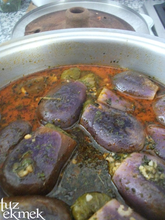 Arada torbanın üstüne bastırarak patlıcanların her tarafına suyun geçmesi sağlanıyor. Bir süre sonra alt üst ediliyor ve tırnağınızı bastırdığınızda hafifçe geçecek diriliğe gelince, süzerek kaynayan sudan alınır.