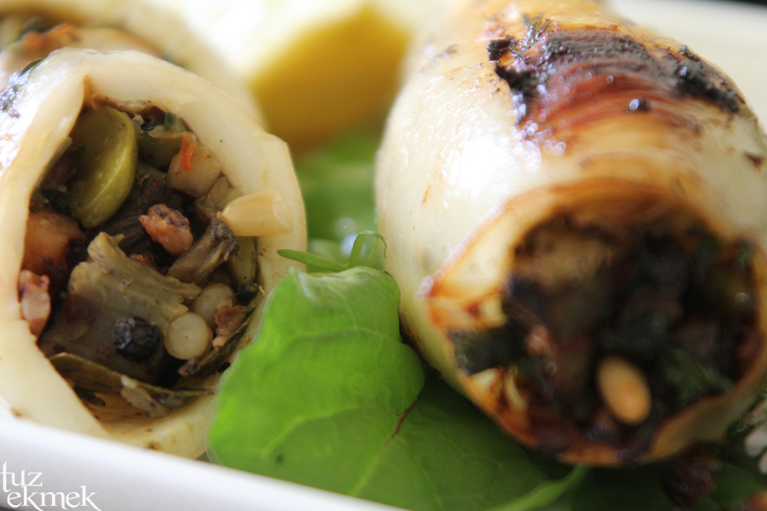 Haşlanmış kalamarlar hazırlanan enginarlı içle doldurulur.