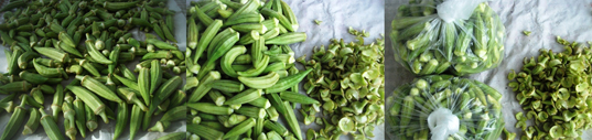 Bamya için; bamyaları güzelce yıkadıktan sonra kalın bir örtünün üzerine serip suyunu çekesiye kadar kurumasını sağlıyorum. Kuruyan bamyaların başlarını yukarı da açıklamaya çalıştığım şekilde temizleyip yeterli miktarlarda torbalar doldurup derin dondurucuda saklıyorum.