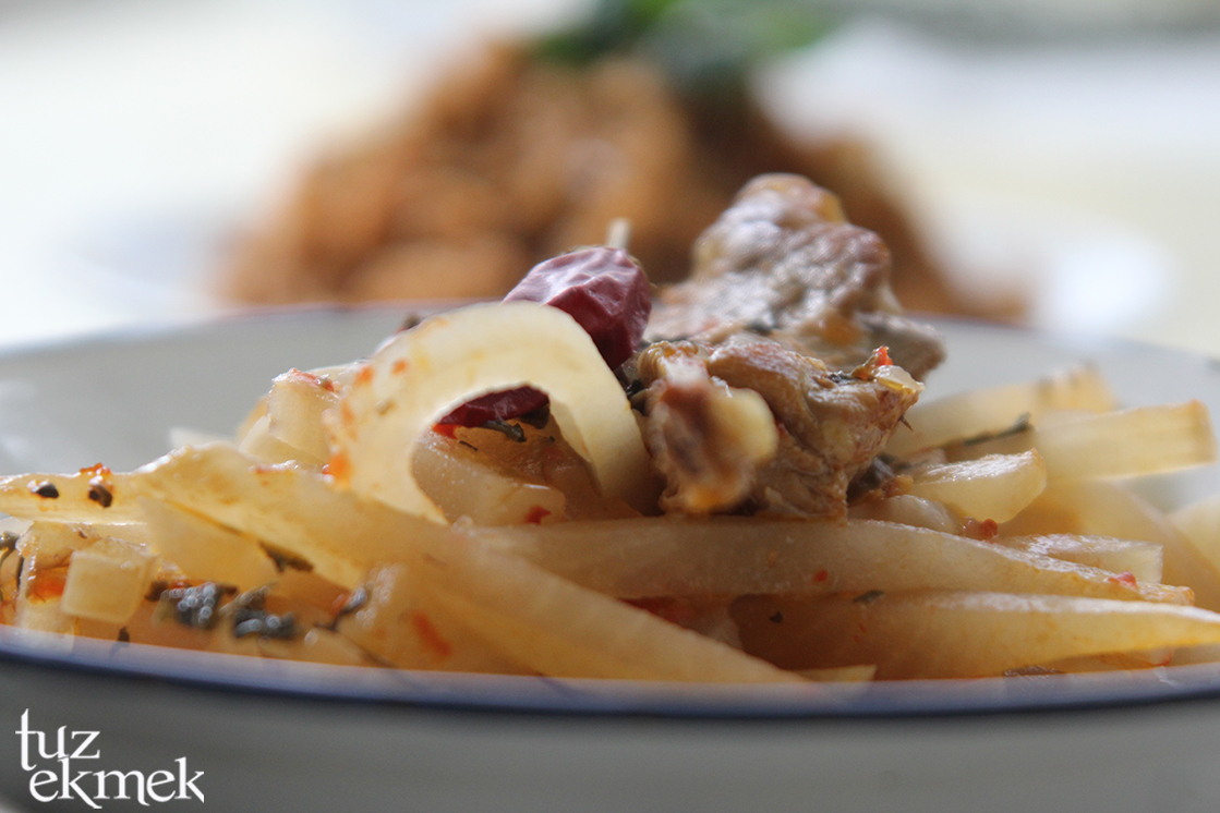 Kaynayan ete süzülmüş çortutular da ilave edilip şalgam ve et lokum gibi olasıya pişirmeye devam edilir.
