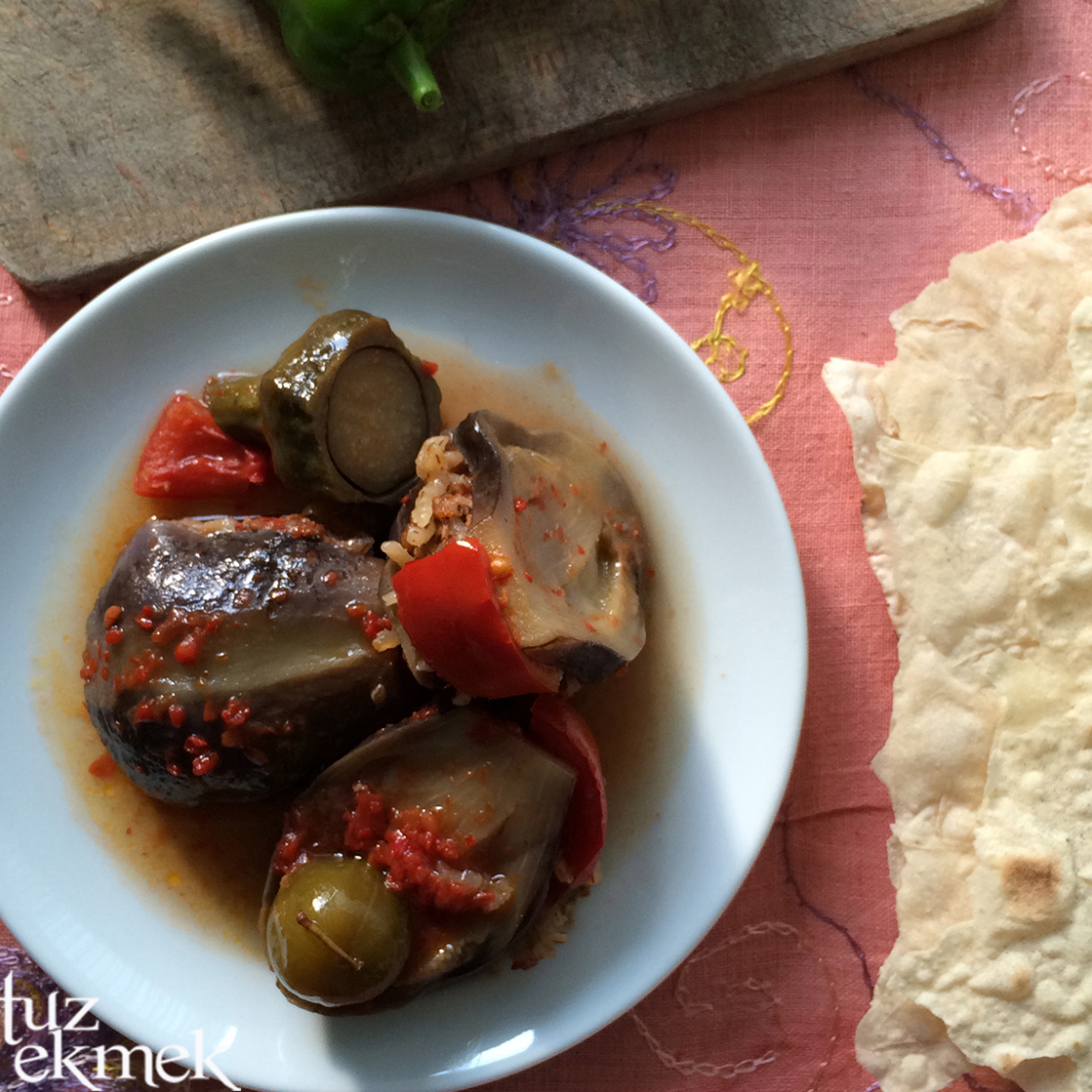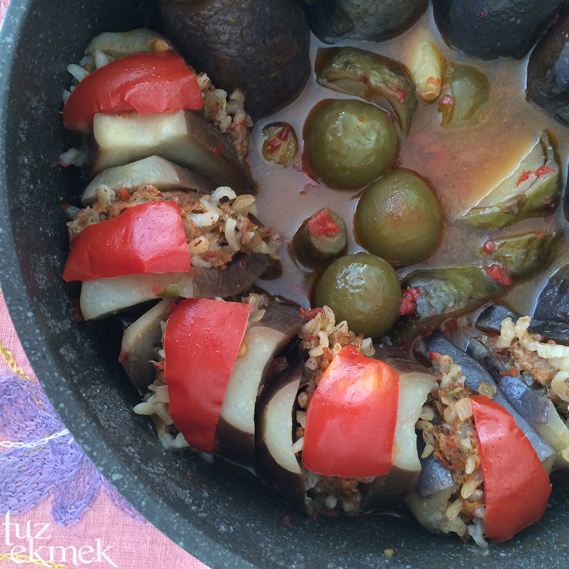 Uygun bir tencereye dizilip kalan kısma patlıcanların baş kısmı, erikler ve kabuklarıyla sarımsaklar bırakılır. Kalan domates suyu bir  o kadar daha suyla karıştırılır ve dolmaların üzerine gezdirilir. En son üzerine birkaç yemek kaşığı zeytinyağı verilir.