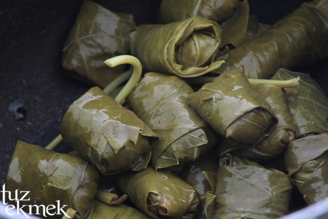 Üzerine sarımsaklar dizilip zeytinyağı gezdirilir- zamanında evde bunun yerine tereyağı yapılırdı – üzerini çok geçmeyecek kadar su ilave edilip bir tabak kapatılır ve kaynayana kadar orta kaynadıktan sonra kısık ateşte sarmalar lokum gibi olana kadar pişirilir.