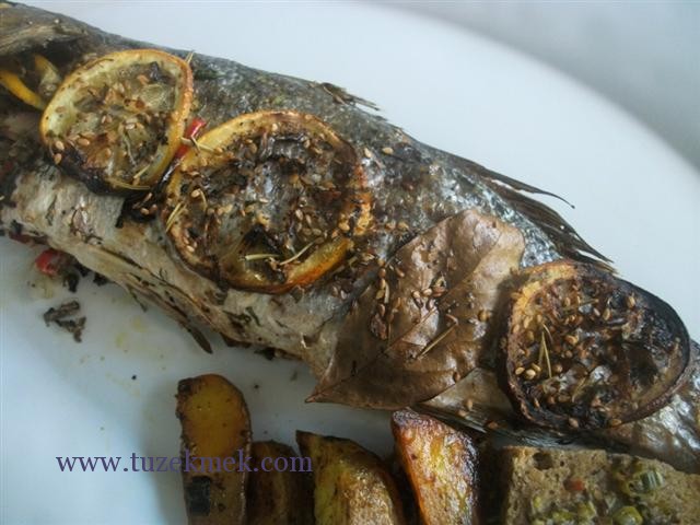 Yağlı kâğıt serilmiş fırın tepsisine koyup, üzerine dilimlenmiş limon ve defneyaprakları sıralanır ve 180 derece fırında üzeri hafifçe kızarana kadar pişirilir. 20- 30 dakika kadar…