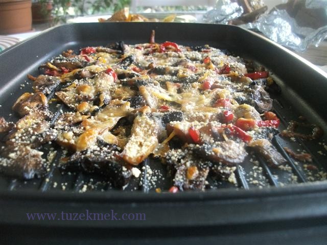 Fırın kabına alınan mantarların üzerine 2 yemek kaşığı parmesan ve bir o kadar da taze kaşar ilave edilir.