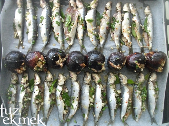 Fırın tepsisine yağlı kağıt serip karşılıklı iki kenara balıkları ortaya incirler gelecek şekilde dizip 180 derece fırında balıklar nar gibi olana kadar pişirilir.