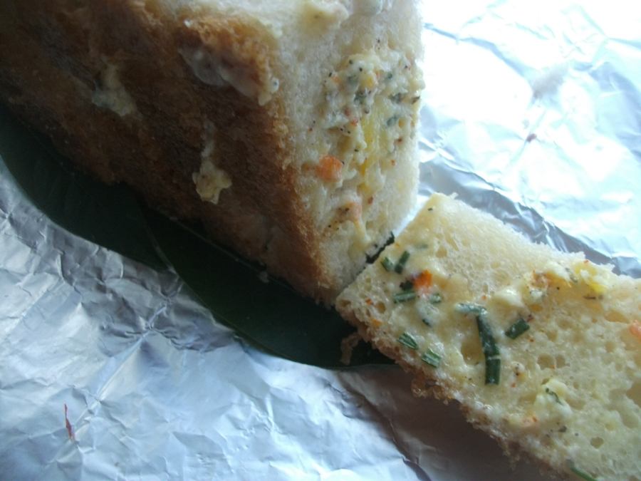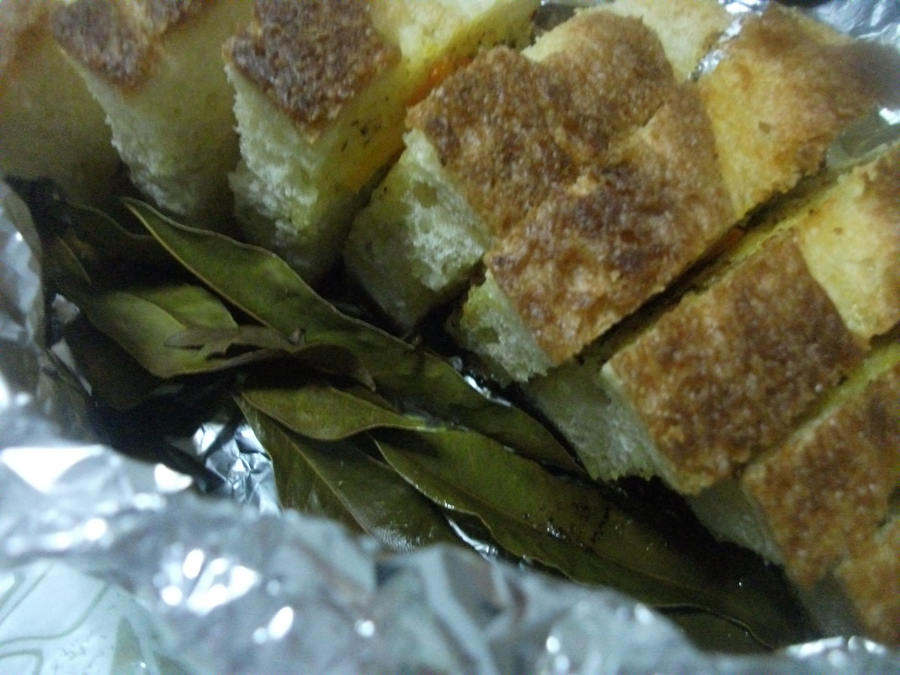 Defne dalları(şimdiye kadar başka bir yerde görmedim, sabah bahçeden toplarken aklıma geldi) alüminyum folyo üzerine yayılır ekmek dilimleri uygun miktarda tereyağı ile yağlanıp, dikey bir şekilde defne yatağının üzerine, birbirlerine yakın bir şekilde dizilir.