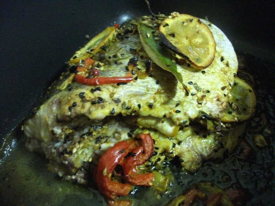 Sos malzemesi balığı alacak bir kaba alınır. Sos, balığın her tarafına sürülür ve kapağı kapatılıp,buzdolabında birkaç saat dinlendirilir. Kıyılmış biberler ve limon dilimlerinin bir kısmı balığın iç kısmına doldurulur.