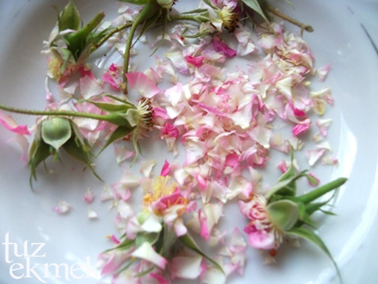 Gül yaprakları saplarından kesilip dip kısmındaki beyazlar kesilip güzelce yıkanır ve süzülür.