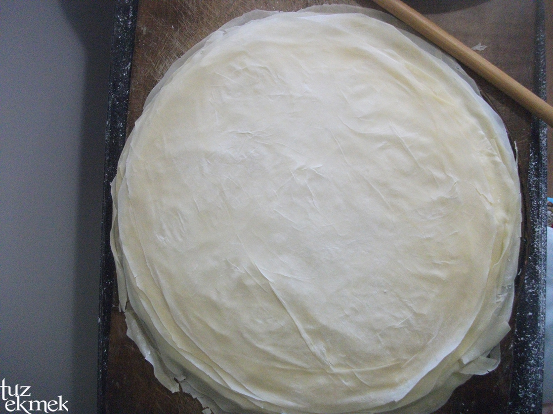 Not; Hamurun kesilip kenarından kalan parçalar ve birkaç tane bütün yufka ile birlikte aralarına eritilmiş tereyağ ve ortasına peynir maydanoz karışımı bırakılıp tarifini paylaştığım ince börek benzeri börek yapılıp israf edilmez.