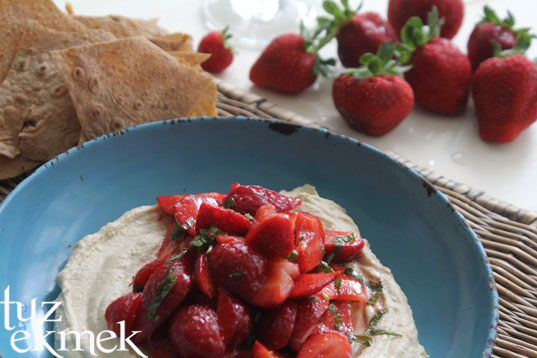 Servis tabağına alınan humusun üzerine çilek salatası uygun miktarda bırakılıp, fırında gevretilen pita eşliğinde serin servis yapılır.