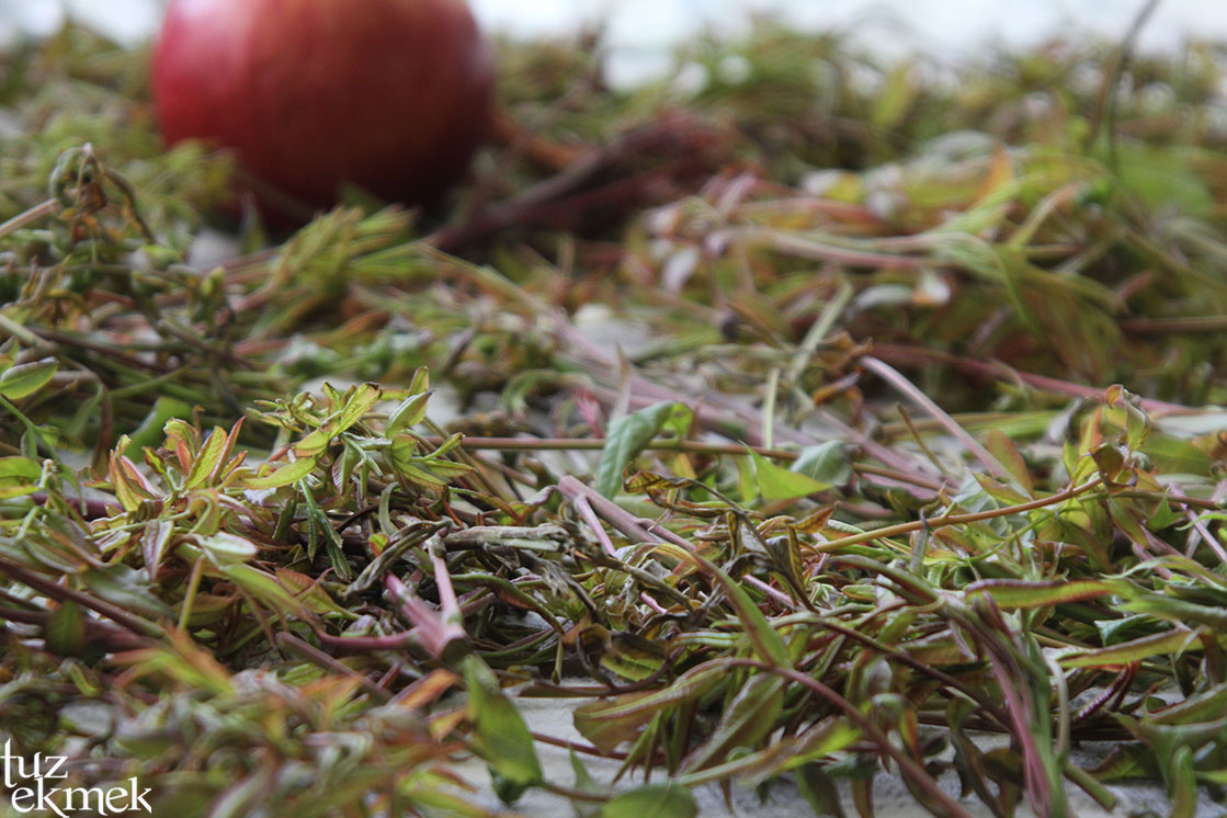 Kekikler 1 cm genişliğinde kıyılır azcık tuz döküp ovulur ve yıkanıp süzdürülür.