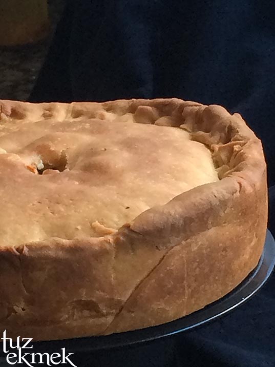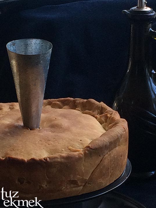 Ortası ayarlanıp artı şeklinde kesik açılıp bir baca hazırlanır. Benim huni şeklinde kalıplarım vardı onu kullandım. üzerine zeytinyağı sürülüp 200 derece ısıtılmış fırında 45- 50 dakika pişirilir.