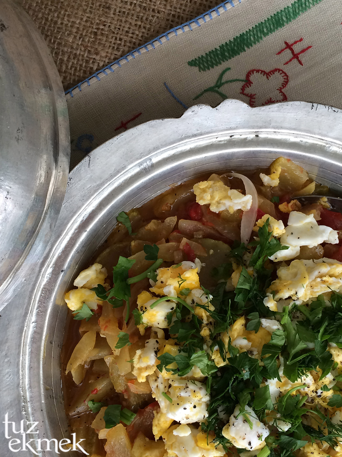 Bu arada bir tavada tereyağı eritilip üzerine yumurtalar kırılır ve bir süre pişmesi sağlanır. Kaşıkla karıştırılıp üzerine pul biber ve karabiber serpilip ocaktan alınır.