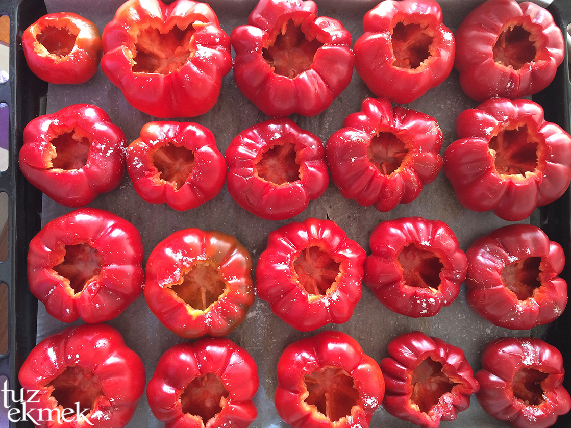 Fırın tepsisine dizilen biberlerin içine tatlı kaşığıyla birer kaşık sirke ve zeytinyağı dökülüp üzerine birer fiske de tuz ve toz şeker bırakılır. Sirke ve zeytinyağını biberin büyüklüğüne göre yarım kaşık kadar artırabilirsiniz.