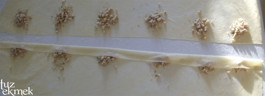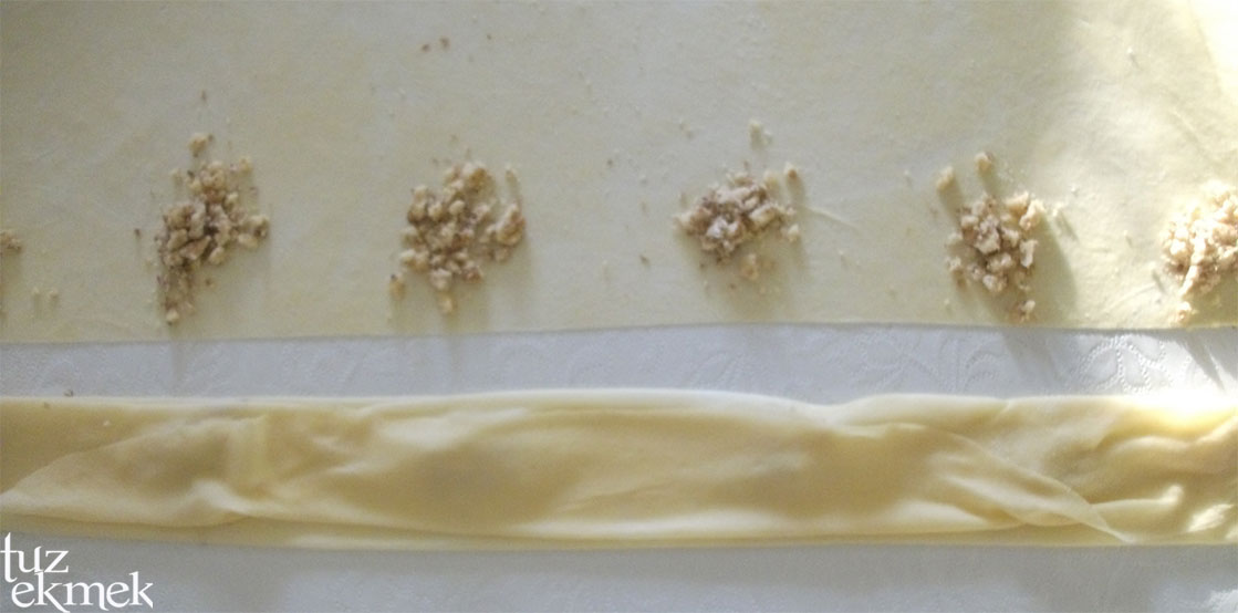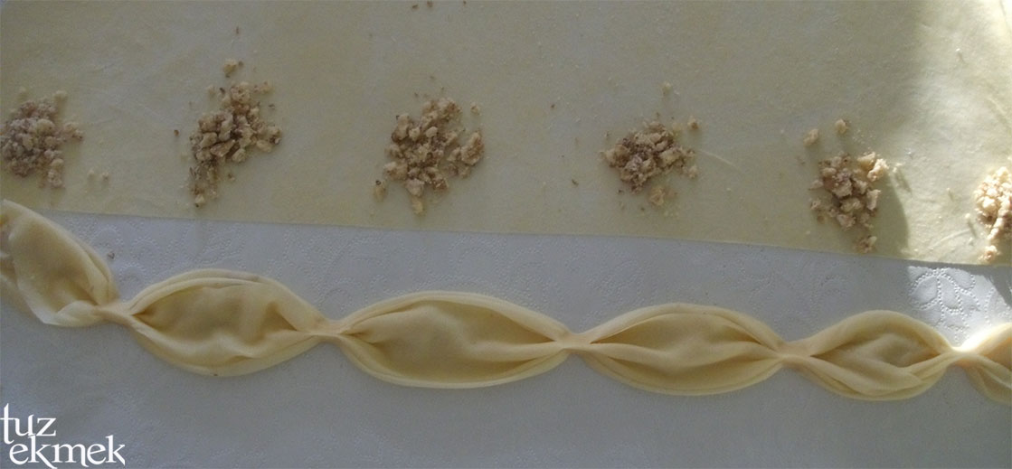 Açılan yufka ikiye katlanıp yarım daire elde edilip uzun kenara cevizler belli aralıklarla 1 er tatlı kaşığı şeklinde bırakılır.
