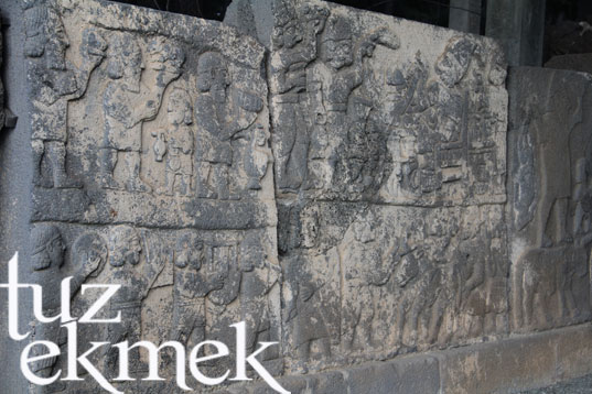Kalenin iç duvarları dönemi anlatan kabartmalarla dolu, kaleyi koruyan kapılarda bulunan muhafızlar ve