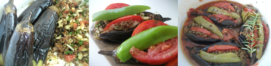 Soğuyan patlıcanlar parçalanmadan ortalarından açılır ve içine kıymalı harçtan doldurulur.