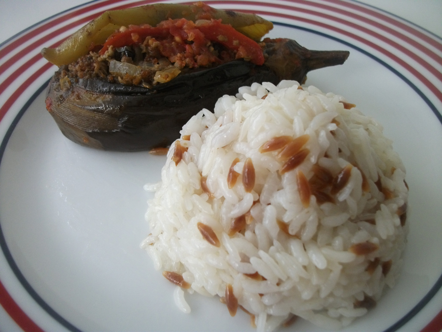 Güzelim kemer patlıcanlar bitmeden yapmak istedim. Genelde yapılan karnıyarıktan farklı olarak malzemelerin içinde çam fıstığı ve sultani üzüm vardı. Sultani üzüm yerine kuş üzümü kullandım.