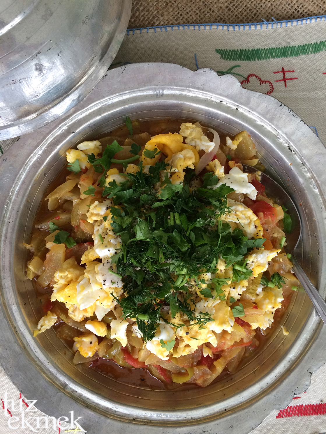 Kabak Çintmesi tarifi Kabak Çintmesi nasıl yapılır? Yörede, hanımlardan öğrendiğime göre bu kabağın yarmalısı, böreği ve bol domatesli yemeği yapılıyor. Fotoğrafdaki kabak biraz sararmaya yüz tutmuş ama biz bu yemeği bu boya gelmemiş, yeşil ve çıtırından yapıyoruz. Pazarda bulabileceğiniz dolmalık kabaklarla da yapılabilir. Malzemeler 1 adet kabak- yaklaşık 1 kilo 3-4 domates 1 adet orta kırmızı soğan 2-3 diş sarımsak 1Türk kahvesi fincanı zeytinyağı Kırmızı pul biber Zerdeçal Karabiber Tuz Maydanoz Dereotu Üzerine 2 yumurta 1 yemek kaşığı tereyağı Yapılışı Zeytinyağında ay şeklinde, incecik kıyılmış soğanlar birazcık kavrulur. Üzerine birazcık zerdeçal, uygun büyüklükte çintilmiş kabaklar ve tuz ilave edilir. Kabak çok taze olduğu için kabuğunu soymadım. Sotelenen kabaklar ve soğanın üzerine ufacık doğranmış domatesler ilave edilir, domatesin suyuyla kısık ateşte pişirilmesi sağlanır. Bu arada bir tavada tereyağı eritilip üzerine yumurtalar kırılır ve bir süre pişmesi sağlanır. Kaşıkla karıştırılıp üzerine pul biber ve karabiber serpilip ocaktan alınır. Pİşen kabak çintmesinin