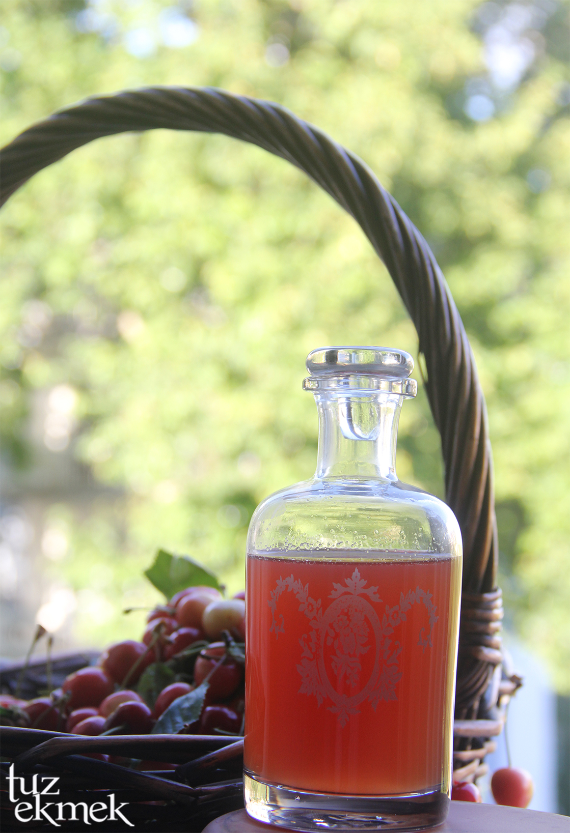 Kiraz Sirkesi tarifi Kiraz Sirkesi nasıl yapılır? Meyveler yemeklerimde hep olur. Onlarla sirke yapmak da bir ayrı heyecan. Elime ne geçerse yapıyorum desem yeridir. Bugün bu senenin sirkesini kurdum. Fotoğraflardaki geçen mevsimin kirazlarından yaptığım. Nerdeyse şerbet diye içilecek gibi:)) Malzemeler Kiraz Nohut Tuz- azcık 1 dilim ekmek Yapılışı Yaklaşık 2 kilo kirazdan yaptım ve içine 1 Türk kahvesi fincanı kadar nohut ve 1 dilim ekmek ve üzerini örtecek kadar içme suyu ilave edip kavanozun kapağını tülbentle kapattım. Taki üzerinde sirke sineği uçana kadar bekletilir. Sinekler ortaya çıktığında tülbentten süzülüp şişeye alınır içine azcık tuz ilave edip demlenmesi sağlanır. İstediğiniz salataya, yapmak istediğiniz turşuya gönül rahatlığı ile kullanabilirsiniz. Afiyet olsun.