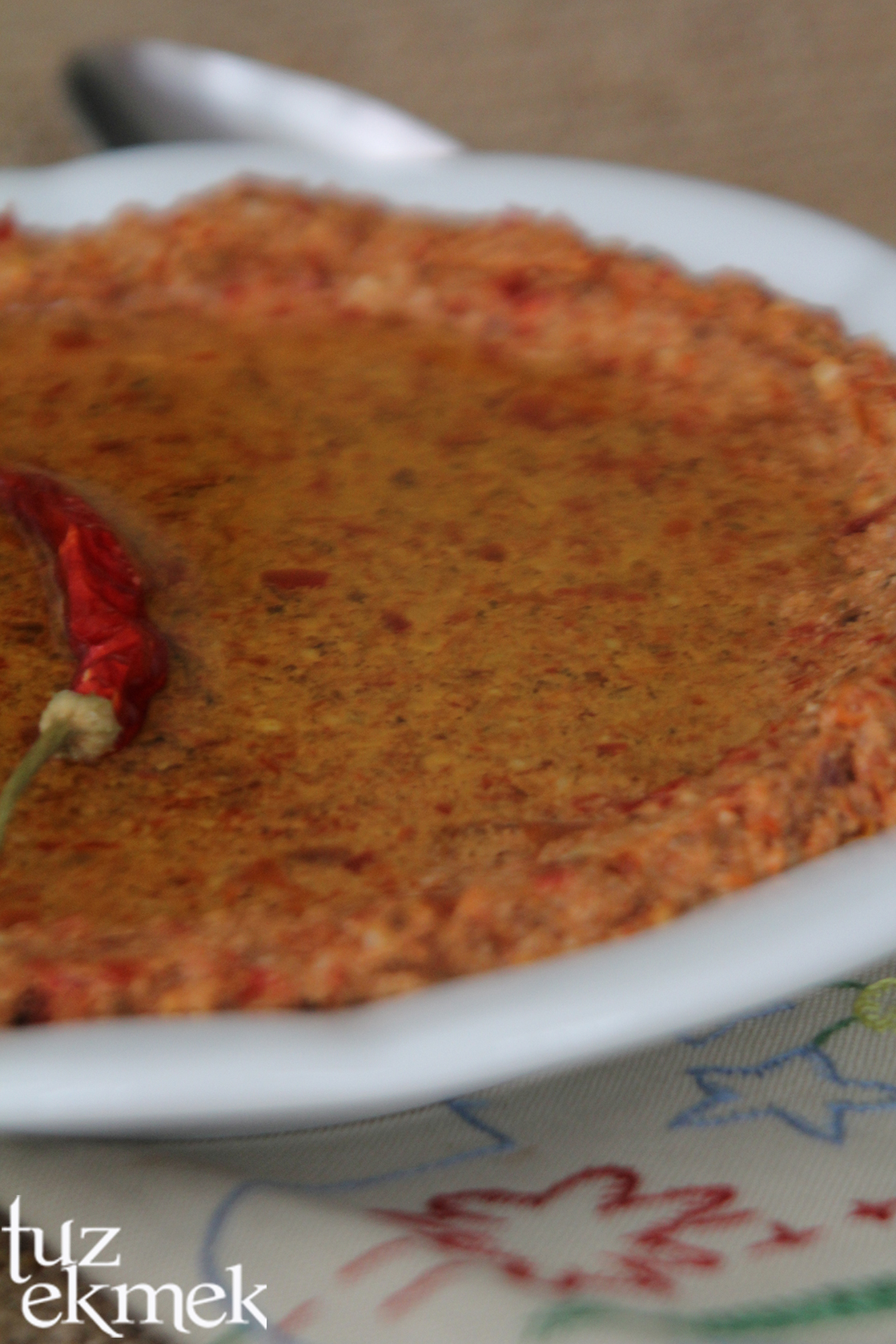 Cevizli Biber tarifi Cevizli Biber nasıl yapılır? Keşşir salatasını yaparken kullandığım cevizli biber bir başka Antakya mutfağının lezzeti. Ana malzemesi, baş biber. Baş biber, Anatakya’da yaz mevsiminde kurutulan acı kırmızı bibere verilen ad yani biber ipe dizilince baş biber oluyor:)) Cevizli bibere nar ekşisi ve zeytinyağı ilave edilince bir başka meze yapmış oluyoruz. Muhammara. Malzemeler 10 tane baş biber ya da 2 yemek kaşığı dolusu biber salçası 250 gr ceviz içi 5 tane kuru kake (yerine etimek ya da kuru ekmek) 1, 5 çay kaşığı kimyon Tuz Zeytinyağı- üzerine Yapılışı Baş biberler yıkanıp sıcak suda 20 dakika kadar bekletilip yumuşatılır. Yumuşayan biberlerin içindeki tohum ve beyaz ksımlar temzilenip süzdürülür. Suyu süzülen biberler, ceviz içi, ıslatılmış kuru ekmek varsa et makinasından ya da mutfak robotundan geçirilip krema haline getirilir. Et makinasında yaptım. Elde edilen karışıma kimyon ve gerekiyorsa tuz ilave edilip karıştılır. Bu aşamada eğer karışım çok katı ise su yardımıyla