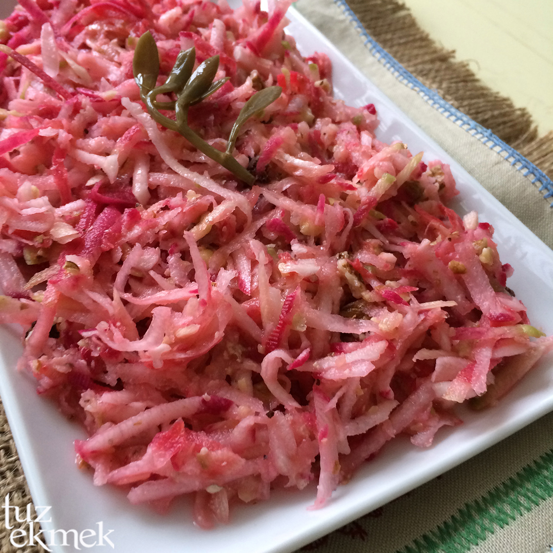Turplu Tarator tarifi Turplu Tarator nasıl yapılır? Yılbaşı sofraları için nefis bir salata. Kolay, lezzetli. Malzemeler 2 orta boy turp 1 çay bardağı ceviz ( Orta boy dövülmüş.) 2- 3 diş orta boy sarımsak 1 limon suyu 1 mandalina suyu Tuz Zeytinyağı ( üzerine azcık) Yapılışı Turplar güzelce yıkanıp kabukları iyice fırçalanıp temizlenir. Temizlenen turplar iri gözden rendelenir. Ayıklanan cevizler orta boyda dövülüp içine azcık tuzla krema gibi dövülen sarımsaklar meyve sularıyla iyice karıştırılır. Rendelenmiş turplar hazırlanan karışımla harmanlanıp bir süre serin bir yerde dinlendirilir. İkramdan önce servis tabağına alınıp üzerine zeytinyağı gezdirilir. Afiyet olsun.