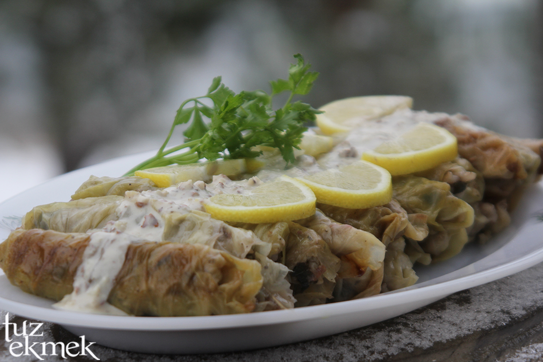 Kestaneli Lahana Sarması- Tarator Soslu tarifi Kestaneli Lahana Sarması- Tarator Soslu nasıl yapılır? Anadolu’nun fos fos, kolay sarılabilen yaprakları olan lahanalarını bulmak zorlaşsa da lahana, kış mutfaklarının vazgeçilmez sebzesidir. Etlisi, zeytinyağlısı , kapuskası, salatası, turşusu diye saymaya başlayınca tadına doyulmaz lezzetler sıralanıverdi. Tarator soslu sarmayı ilk defa Antalya’da, çok sevdiğimiz bir ailenin sofrasında tatma fırsatım olmuştu. O günden beri arada yaparım. Kestaneli sarma ise bir zamanlar çok meşhurdu. Kestane diyarına yakın olunca yeniden aklıma geldi ve geçenlerde bir arkadaş toplantısı için yapmıştım. Çok beğenildi. Malzemeler 1 büyükçe lahana 2 su bardağı Baldo pirinç 6 tane orta boy soğan- incecik kıyılmış 1,5 su bardağı haşlanmış soyulmuş kestane- orta boyda parçalanmış 1 küçük demet maydanoz- ince kıyılmış 1 küçük demet dereotu- ince kıyılmış 1 yemek kaşığı kuru nane ya da 1 küçük demet taze nane- ince kıyılmış 1 paket çam fıstığı 1 Türk kahvesi fincanı kuş üzümü 1 çay kaşığı yeni bahar 1