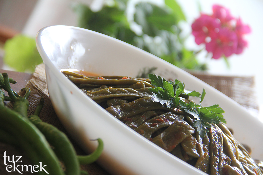 Zeytinyağlı Taze Fasulye tarifi Zeytinyağlı Taze Fasulye nasıl yapılır? Fasulye deyince boncuk bilirim başkasına pek bakmam. Ama burada o kadar çeşit fasulye var ki boncuk çıkana kadar onunla başladık. Adı da pek bir hoş. Nazende. Lezzeti de yerinde. Hepimizin kendine göre bir zeytinyağlı fasulye yapışı vardır mutlaka, bir de benden olsun dedim. Lezzetli olduğu söylenir. Yaz sofralarının vazgeçilmezi, zeytinyağlı fasulye. Malzemeler 1 kg taze fasulye 3 orta boy soğan 3 diş sarımsak 4 tane domates 1 Türk kahvesi fincanı zeytinyağı 10 sap maydanoz 1 tane sivri biber 1 tatlı kaşığı toz şeker- arzuya bağlı 1 tatlı kaşığı tuz Yapılışı Taze fasulyeler güzelce yıkanıp süzülür. Ayıklarken baş ve uç kısımları, varsa kılçığı alınır. Uygun bir tencereye zeytinyağının yarısı bütün haldeki soğanlar orta kısma etrafına fasulyenin yarısı dizilir. Araya rondoda çekilmiş domatesin yarısı, bütün sarımsaklar, bütün halde sivri biber ve sapıyla birlikte maydanozlar yayılır. Üzerine tuz ve şeker serpilir. Ara katın üzerine kalan fasulyeler