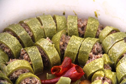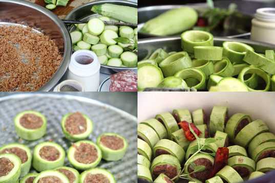 Bulgurun üzerine kıyma, karabiber, tuz, pul biber, incecik kıyılmış taze reyhan ve kuru reyhan ilave edilir ve güzelce yoğrulur. Arada 1- 2 yemek kaşığı su serpilir. İstenilen kıvama gelince halka şeklindeki kabaklara doldurulur. İçin miktarı fazla ve sıkı olmamasına dikkat edin.