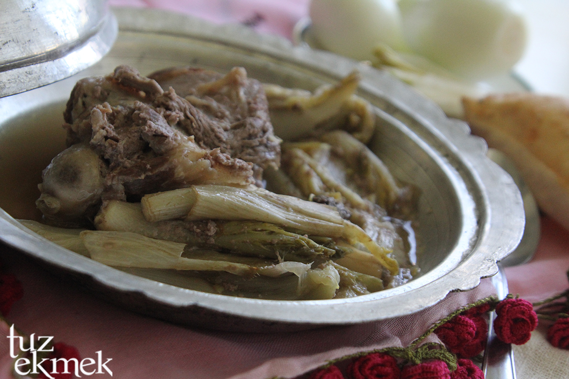 Döküm tencereye birazcık zeytinyağı ilave edilip ısıtılır bütün haldeki soğanlar, sarımsak yıkanıp kurulanmış et parçaları bırakılıp mühürlenir. Etin rengi değişip bir miktar kızarınca üzerine sıcak su ilave edilip etler yumuşayana kadar orta ateşte pişirilir.