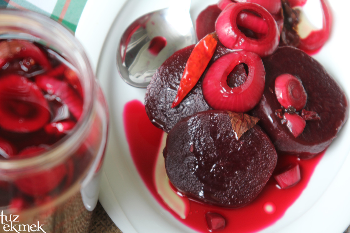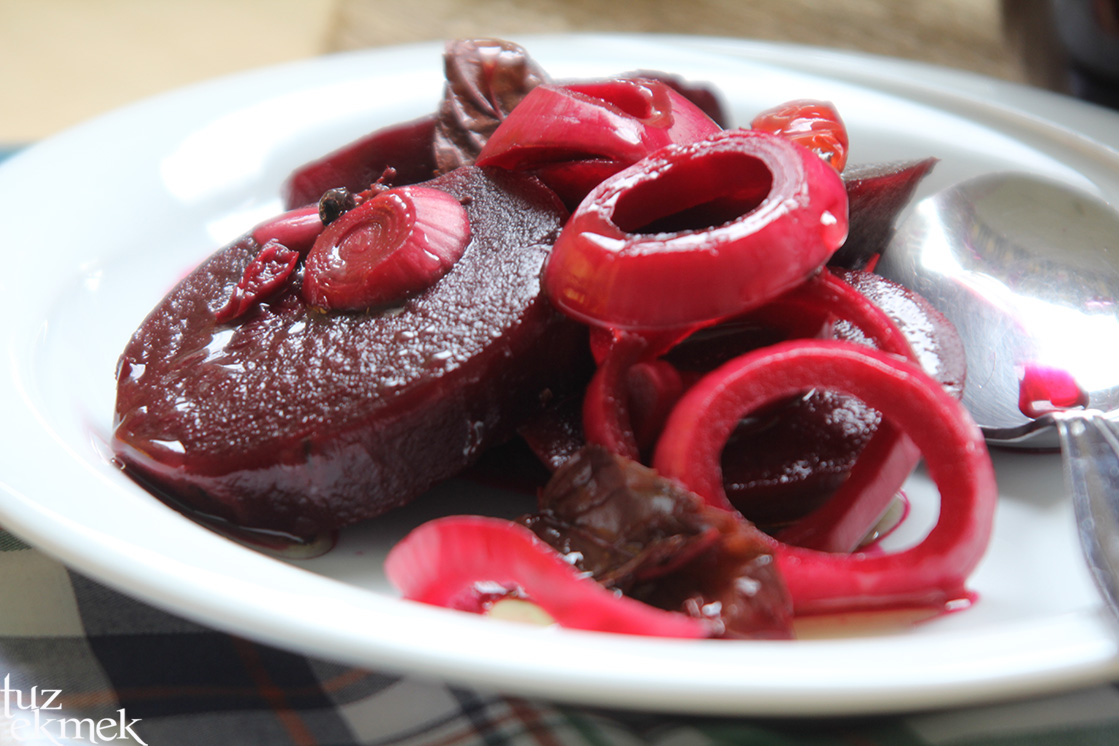 Eline sağlık,Amasra’da balığın yanında salatanın içine koyarlar pancar turşusunu,o zamandan beri ben de incecik dilimleyip salatalara koyuyorum.Hem pancar hem de soğan turşusu olmuş,renkler ise bir harika 🙂