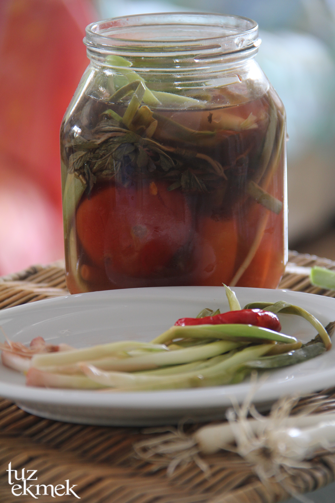 Körmenler ayıklanır. Bazılarının başları varsa başlı bırakılır. Tuzlu sirkeli suda güzelce yıkanır. Havuç soyulup ikiye bölünür. Domates yıkanıp bir iki yerinden iğnelenir.
