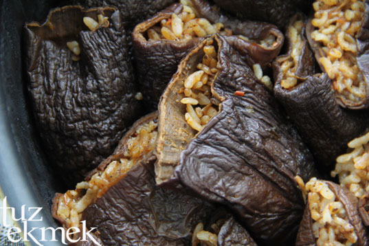 Haşlanmış patlıcan ve ıslatılmış biberler yarıdan biraz fazla doldurlur. Kalan içle yaprak sarılır.